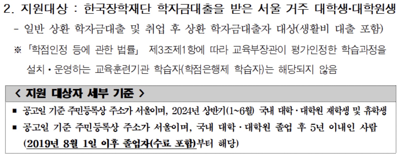 위에도 기재되어 있지만 서울시 하반기 학자금 대출 이자지원을 받으시려면, 중요한 공고일 기준 주민등록상 주소가 서울로 되어 있어야 되며, 2024년 상반기(1-6월) 국내 대학교 및 대학원 재학생 혹은 휴학생도 포함이 되구요. 졸업(수료)한지 5년 이내인 인 사람에게도 지원이 가능하답니다.