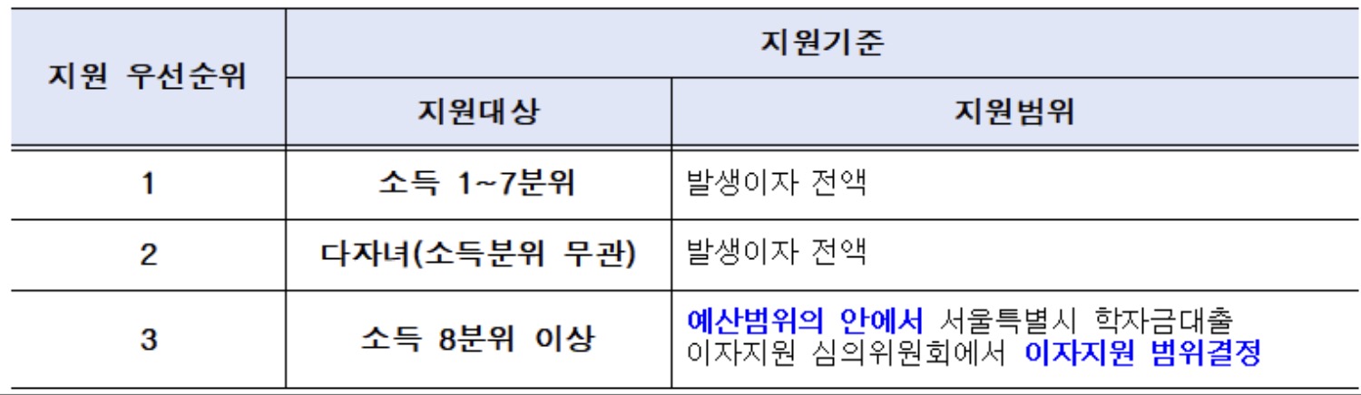 지원 기준으로 우선순위가 존재하는데요. 1순위에는 소득 1~7분위, 학자금대출 발생 이자금 전액 지원되며, 2순위 다자녀(소득분위 무관), 발생이자 전액 지원 받을 수 있습니다. 마지막 3순위로 소득 8분위 이상, 예산범위의 안에서 이자 지원 범위 결정되는 점을 숙지하시기 바랄게요.