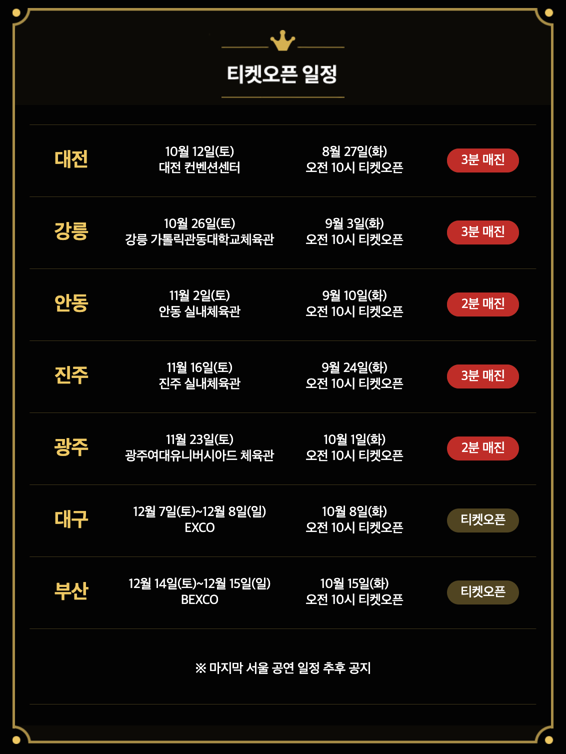 대구 : 티켓오픈일 - 10월 8일 화요일 10:00am / 공연일 - 12월 7일~8일(토,일요일) / 장소- EXCO